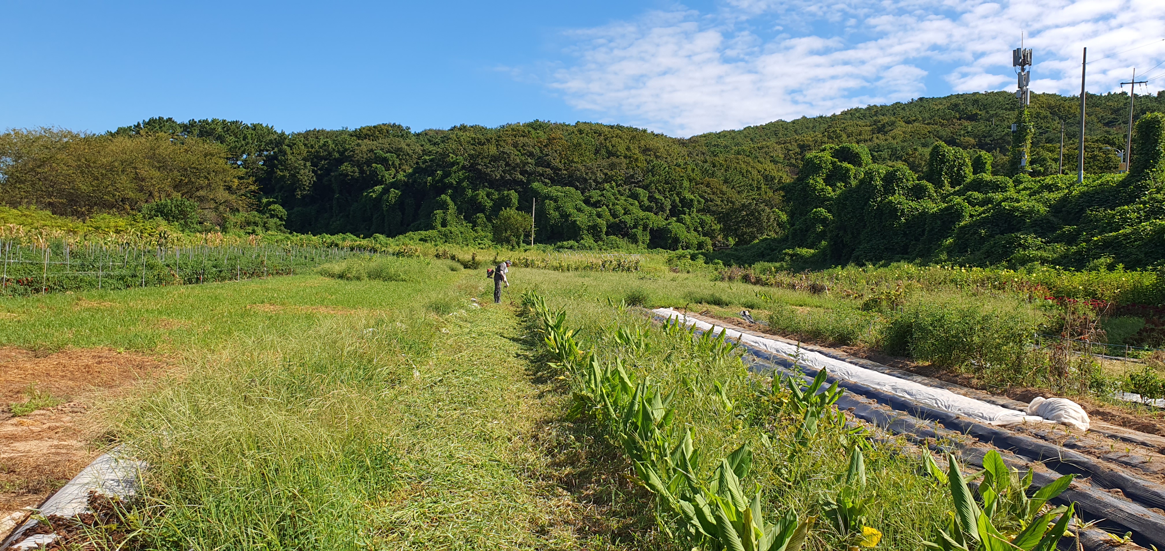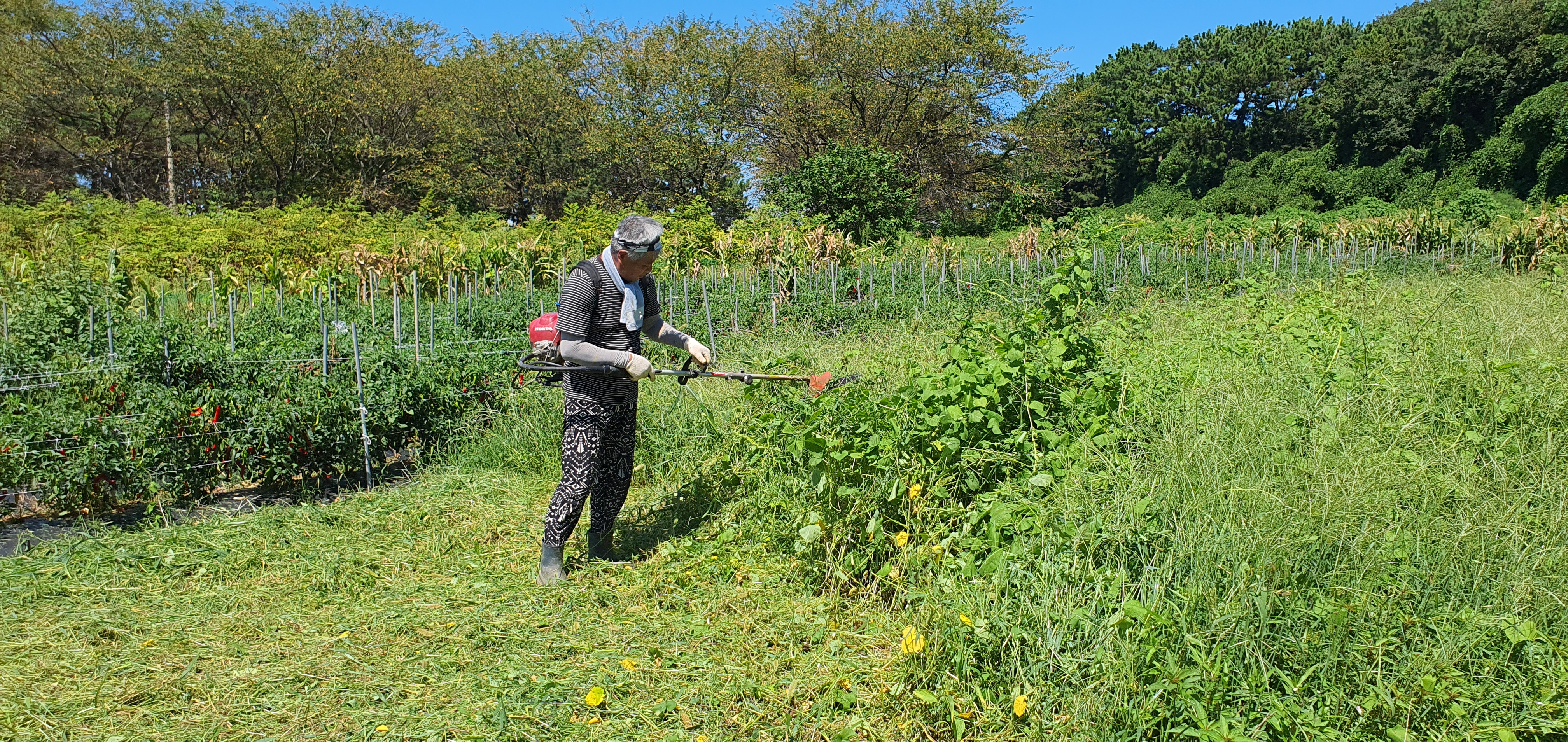 마늘,딸기 수확 후 풀이 풍성히 난곳을 예초작업 중인 신순규 농부