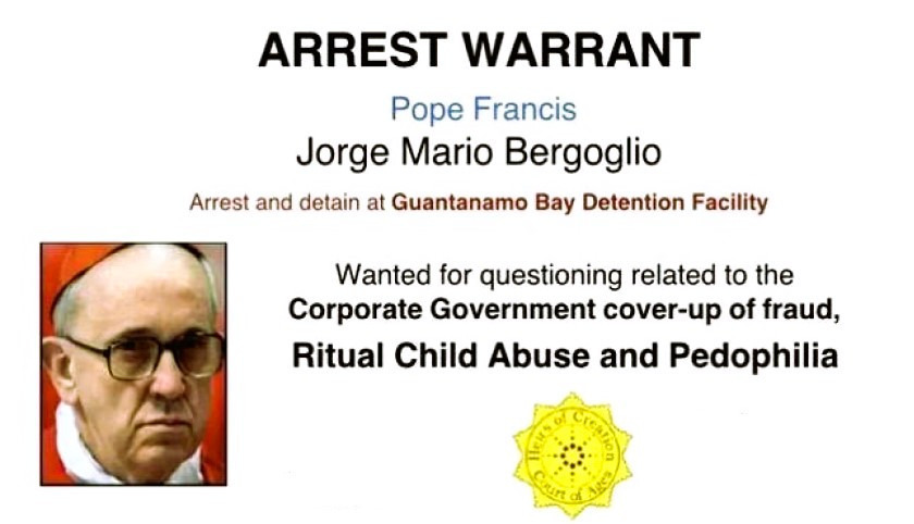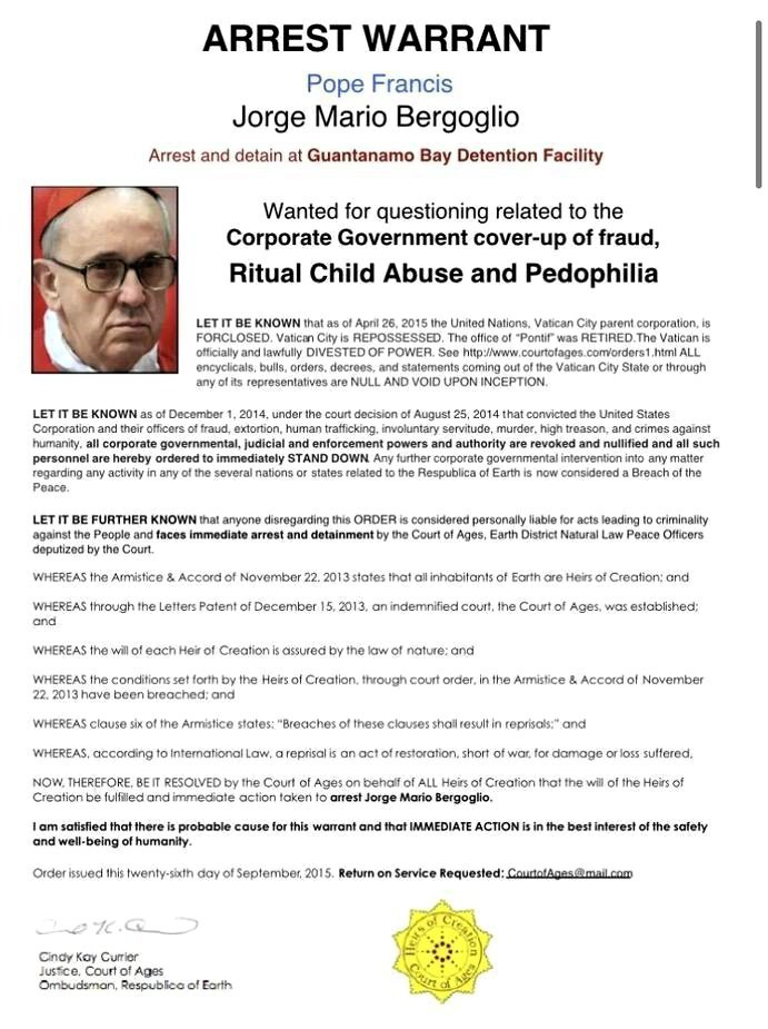 BOOM! ARREST WARRANT! Pope Francis - Jorge Mario Bergoglio - Arrest and detain at Guantanamo Bay Detention Facility - Wanted for Corporate Government cover-up of fraud, Ritual Child Abuse and Pedophilia Ready to uncover the truth? Sick of the lies? Join ou