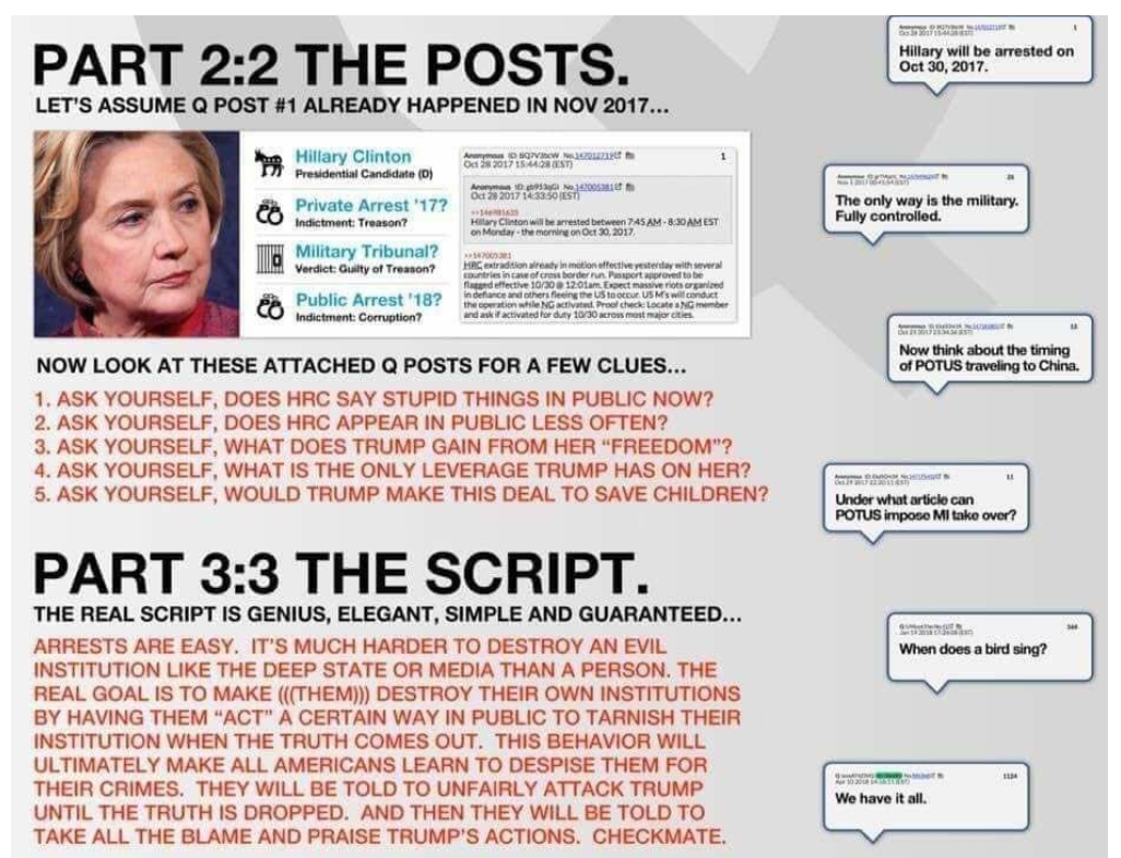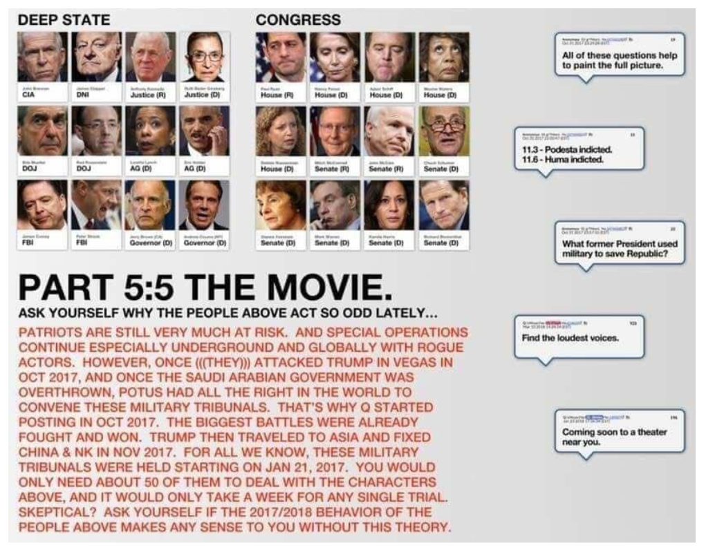 Operation Warp Speed , 군사 백신 배달 작전은 반인륜 범죄, 반역 및 기타 중범죄(군대가 치료제)에 대한 군을 통한 대량 체포를 위한 이러한 기소를 비밀리에 공개하는 것으로 여겨진다. 우리는 몇몇 잘 알려진 반역자 또는 소아성애자에게 생중계된 백신 주사(대부분은 가짜 주사를 위해 소품 바늘을 사용하는 것으로 보임)를 많이 보았다.