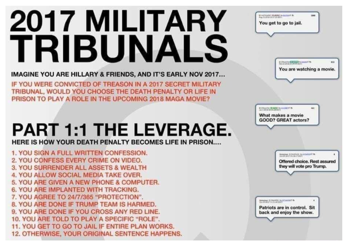 세계와 정치 엘리트들 주변에 그물이 조여지면서 그들의 운명에 대한 추측이 난무하고 있습니다. 연방 법원, 국제 법원, GITMO의 군사 재판소는 혐의가 있는 가해자들이 재판을 받도록 할 태세를 갖추고 있는 듯합니다.