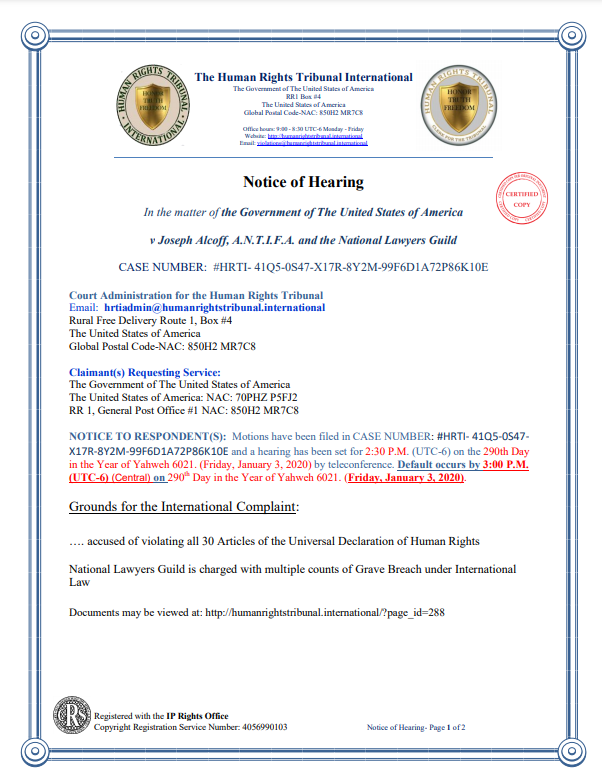 또한, ANTIFA, CDC, 파우치, 게이츠 재단, 전미 변호사 협회, 전미 주지사 협회, 로스차일드 가문, WHO 등이 연루된 대량 학살을 저지른 전쟁 범죄를 포함하여 세계인권선언(UDHR)의 30개 조항을 모두 위반한 것과 관련된 수많은 문서가 인권재판소 국제 웹사이트에 게시되었습니다.