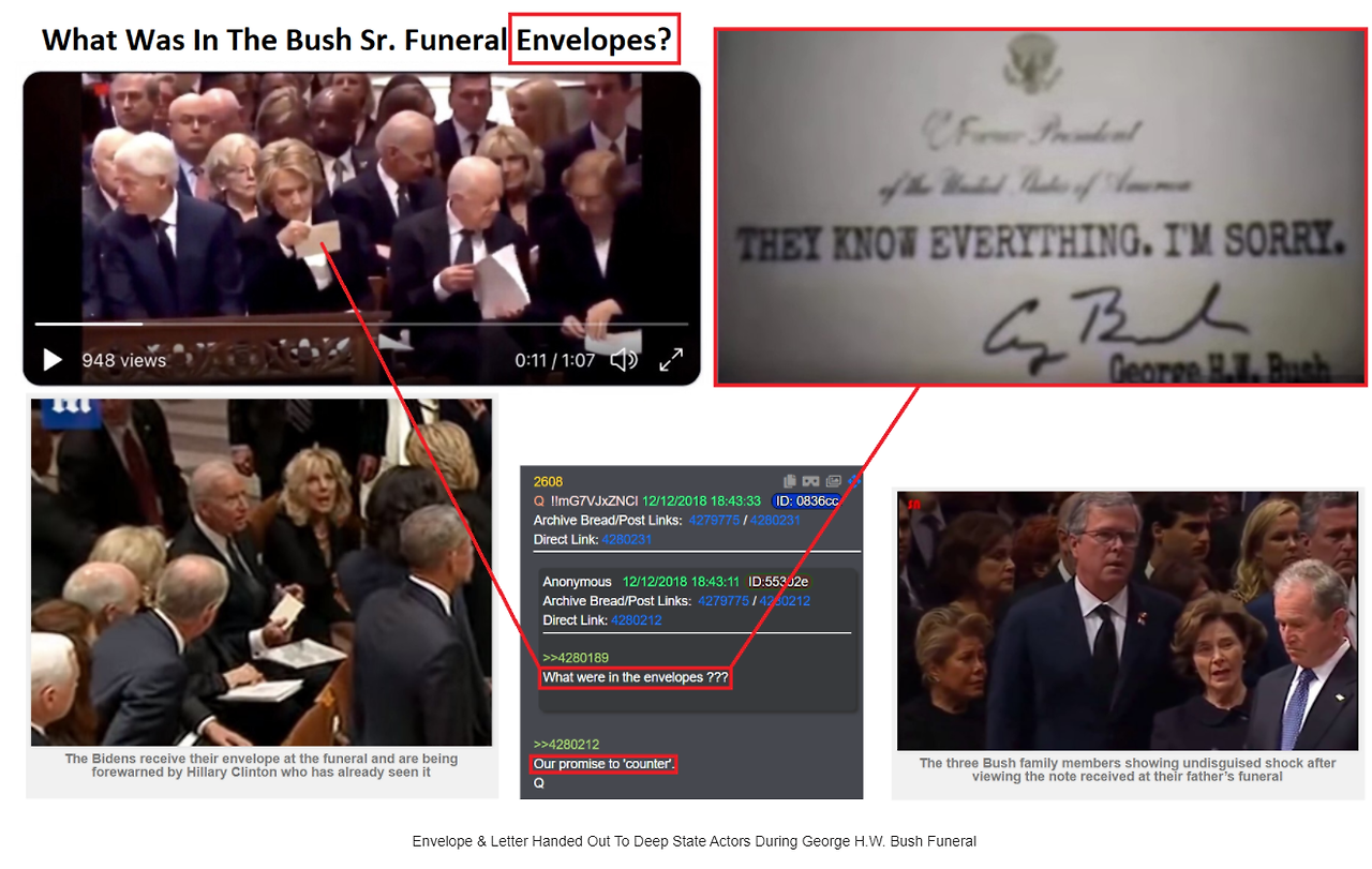 이러한 딥 스테이트 엘리트 중 다수는 조지 HW 부시의 장례식에서 나눠준 비밀 봉투를 통해 다가올 체포에 대한 경고를 받았습니다. 다음 영상과 이미지는 편지를 받은 사람들 중 몇몇과 그 편지에 정확히 무엇이 쓰여 있는지 보여줍니다.