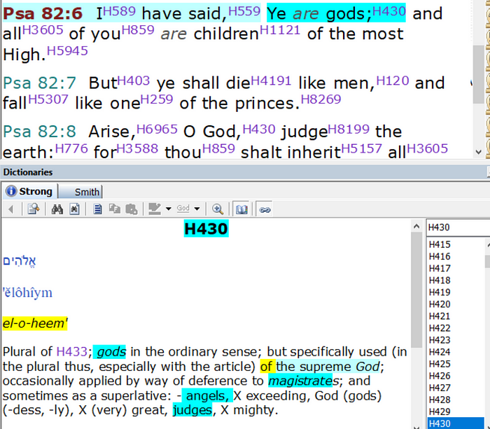 '신'이라는 단어는 히브리어로 H430 אֱלֹהִים 'ĕlôhı̂ym 이며 Strong's Concordance에서는 다음과 같이 정의되어 있습니다 .
