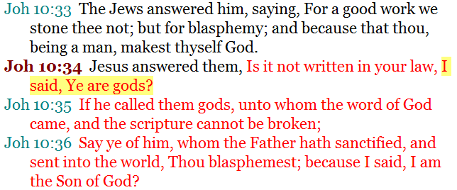 예수님은 요한복음 10장 34절 에서 유대인들에게 이렇게 말씀하셨습니다. “예수께서 그들에게 대답하시되 너희 율법에 기록된 바 내가 너희를 신이라 하였노라 하지 아니하였느냐?” (킹제임스성경)