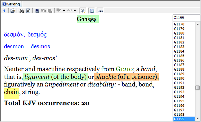영어: 사슬 이라는 단어 는 그리스어 G1199 δεσμόν desmon으로, 띠, 즉 (몸의) 인대 나 (죄수의) 족쇄를 의미합니다 . 은유적으로 장애물이나 장애: — 띠, 끈, 사슬, 끈.