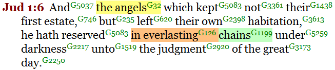 “또 자기의 처음 지위를 지키지 아니하고 자기 처소를 떠난 천사들을 큰 날의 심판까지 영원한 사슬 로 흑암 아래에 가두셨느니라 .” - 유다서 1:6 (킹제임스성경)