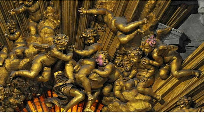 제단에는 천사들이 하늘에서 우리 인간의 살인 신체의 인대에 떨어지는 모습이 묘사되어 있습니다!