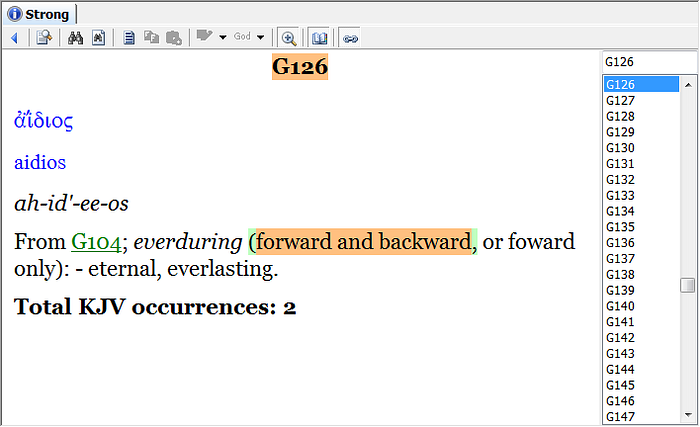 영원하다는 단어 는 그리스어로 G126 ἀΐ́διος aidios로, 항상(앞으로 그리고 뒤로) 또는 앞으로만이라는 의미입니다. — 영원한, 영원함.