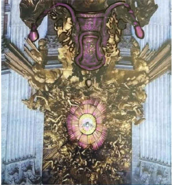 스테인드 글라스에 비둘기를 그린 원형 창문은 질의 개구부와 완벽하게 일치합니다. 교황의 모자는 난소이고 왕좌는 나팔관처럼 뻗어 있습니다.
