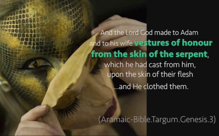 “그리고 주 하나님께서는 아담과 그의 아내에게 뱀의 가죽으로 만든 존귀한 옷을 만들어 주셨는데 , 뱀에게서 벗어던진 가죽은 그들의 살의 가죽 위에 입혀 주셨고, 벗어던진 장식물 대신에 입혀 주셨습니다.” — (출처: 요나단 벤 우지엘의 타르굼, 창세기 )