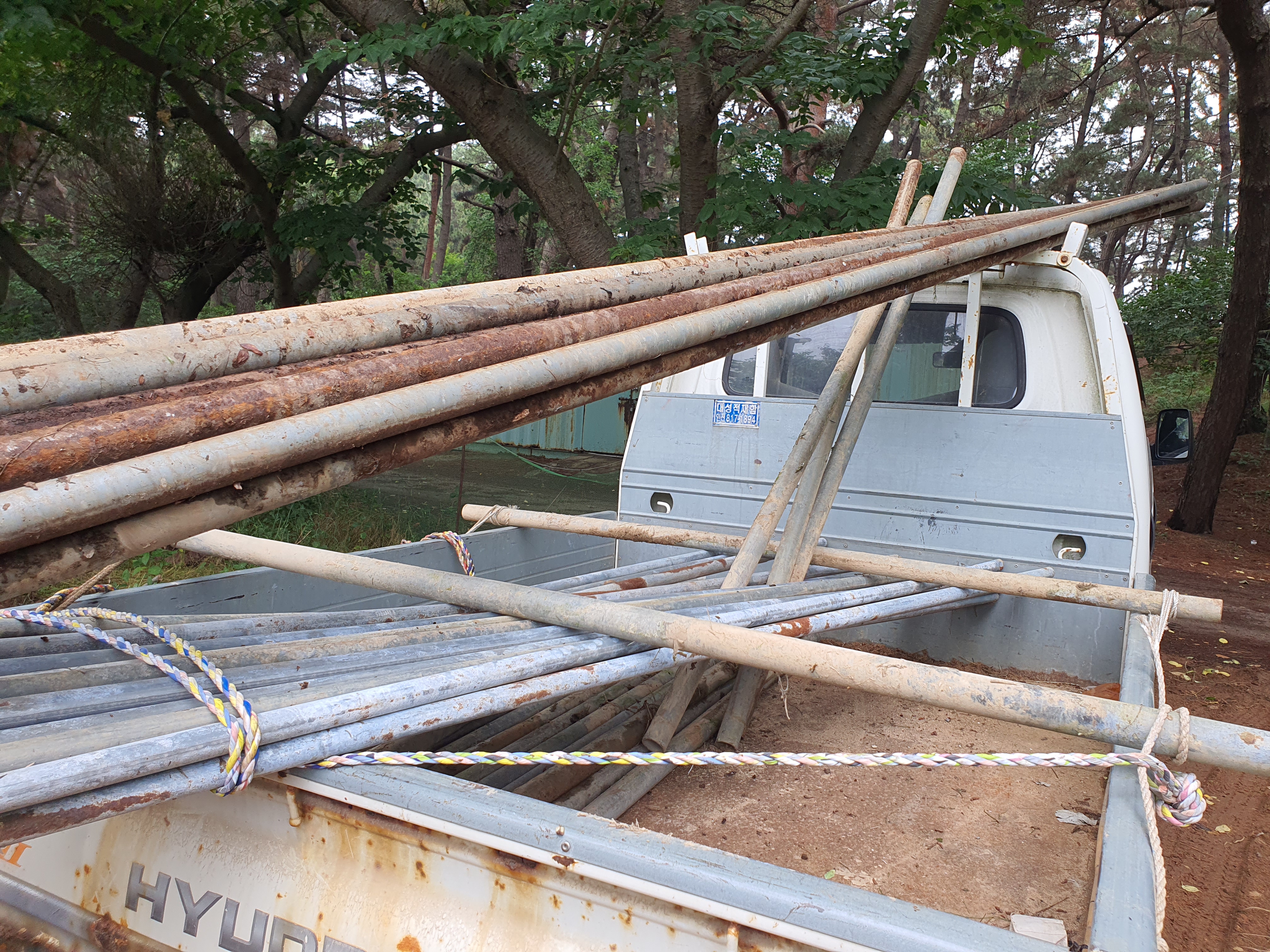 신순규 농부는 닭장이 있는곳에 전에 사용했던 아시바파이프 길이 8m 되는 것을 혼자 트럭에 실어 옮겼습니다.
