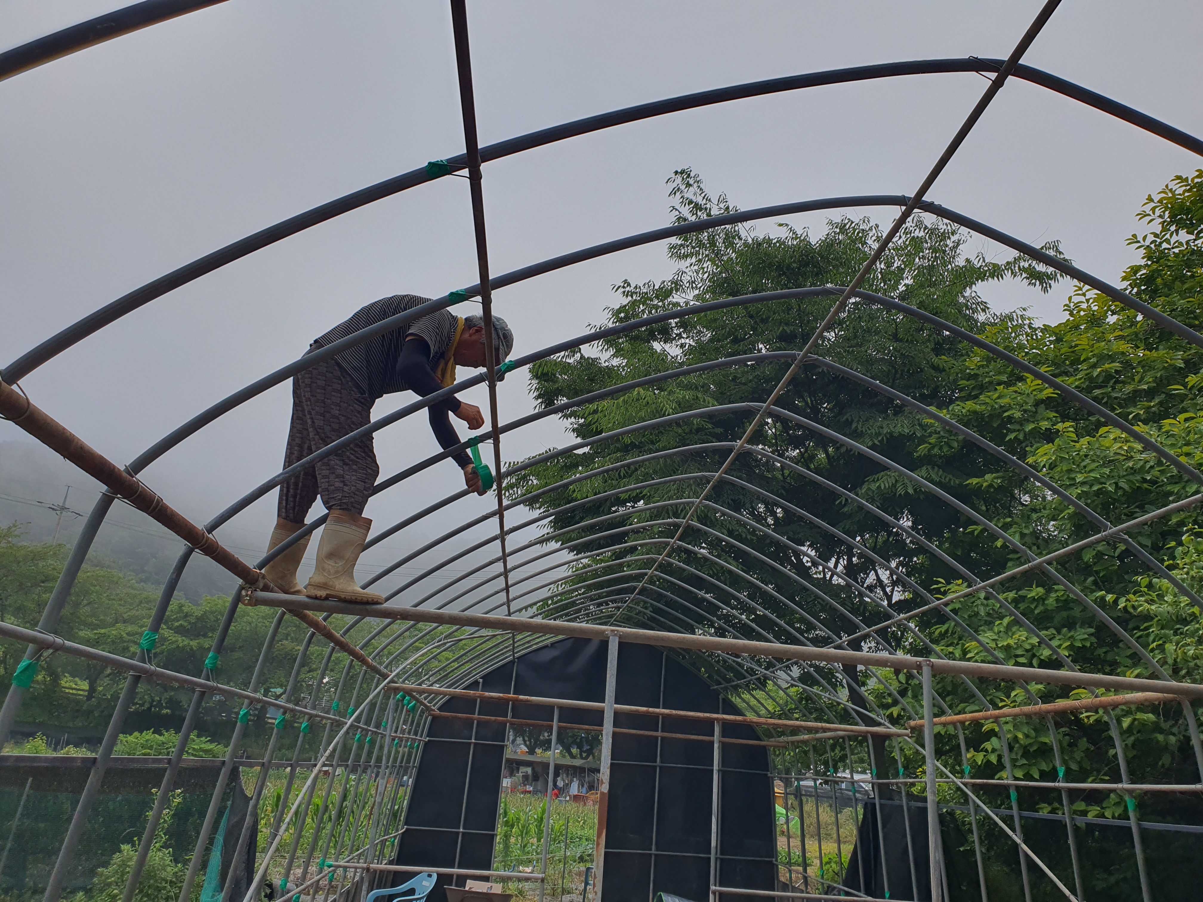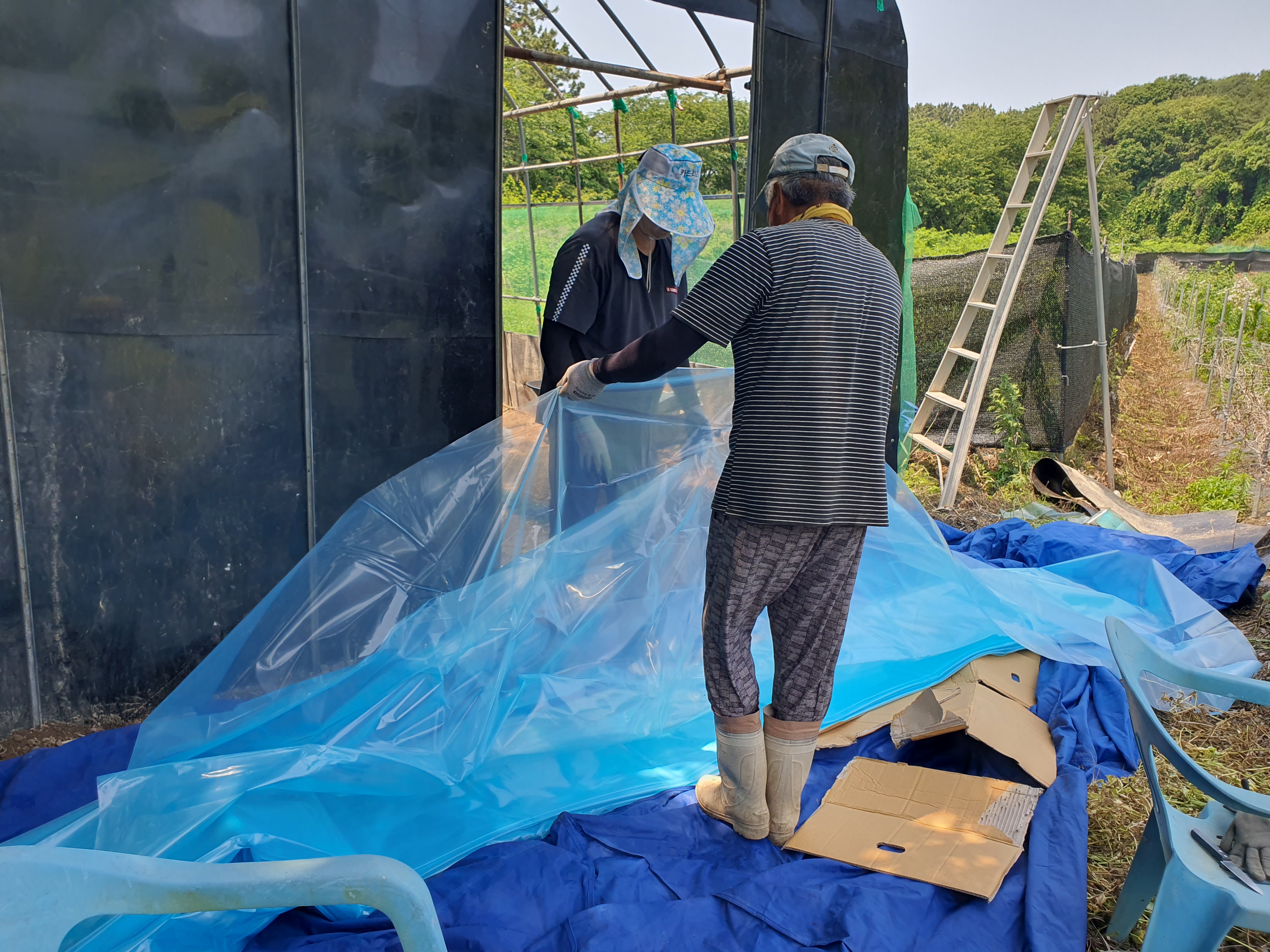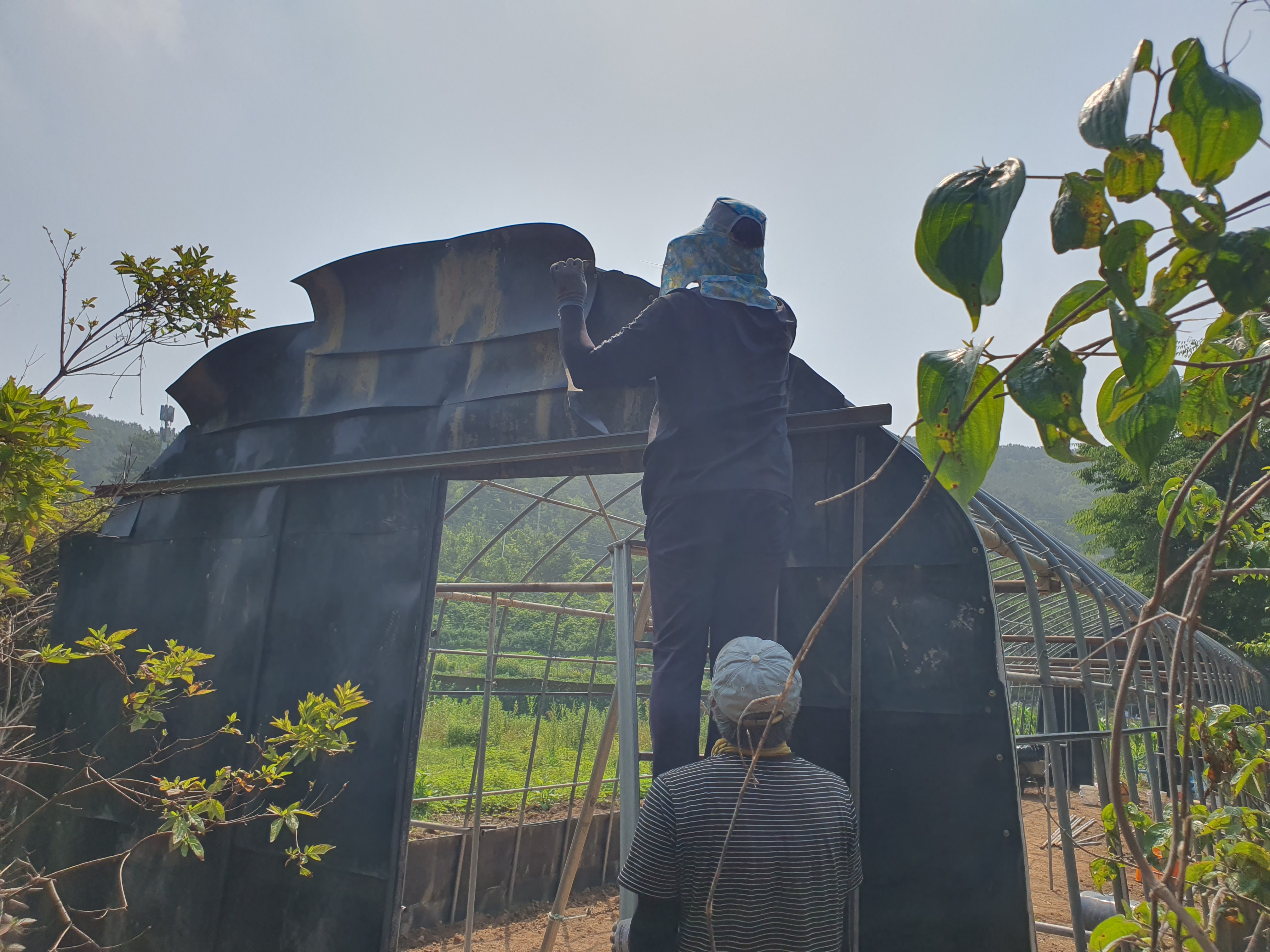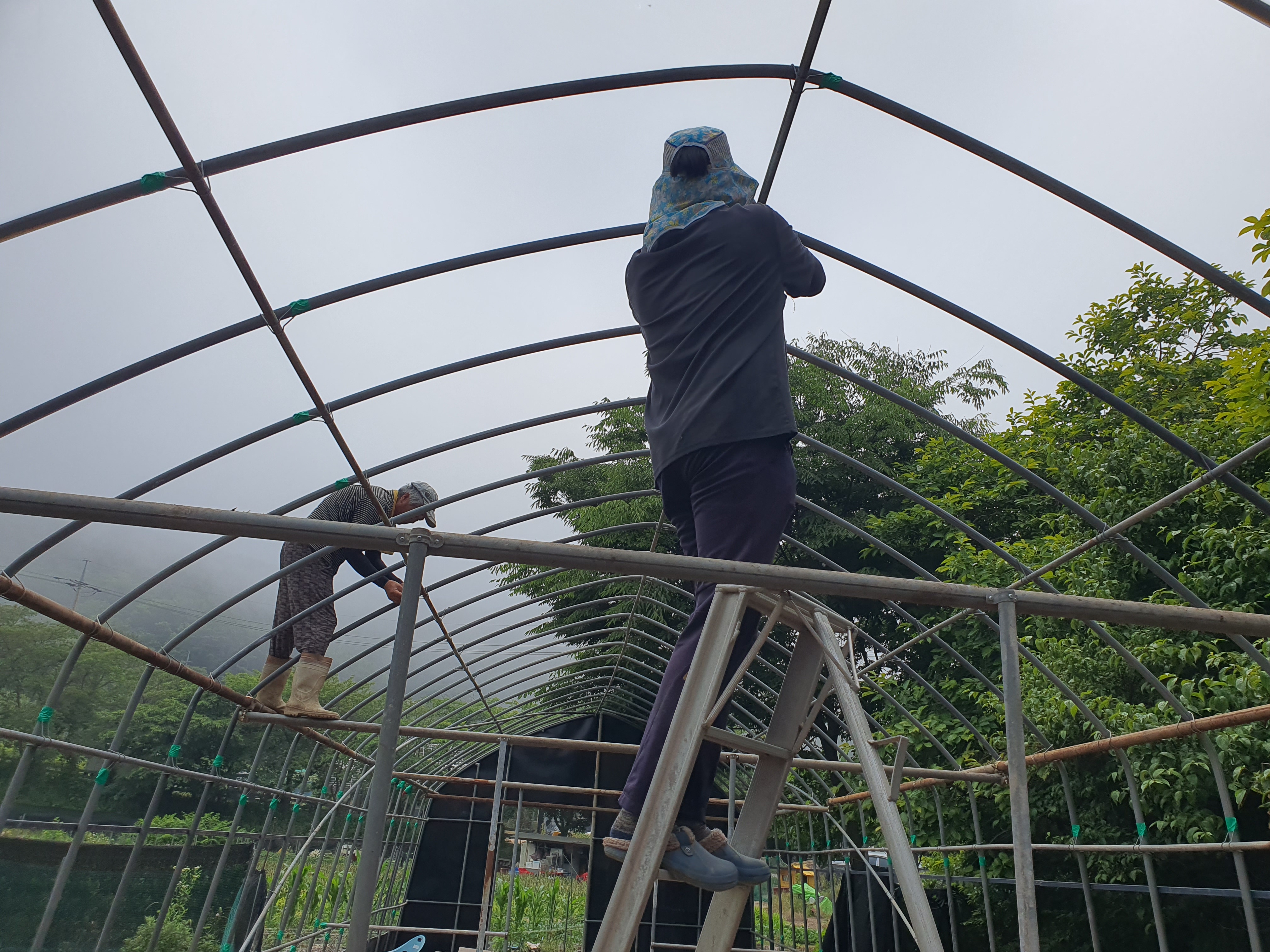 건조하우스 비닐과 차광망 씌우기 아들과 아버지