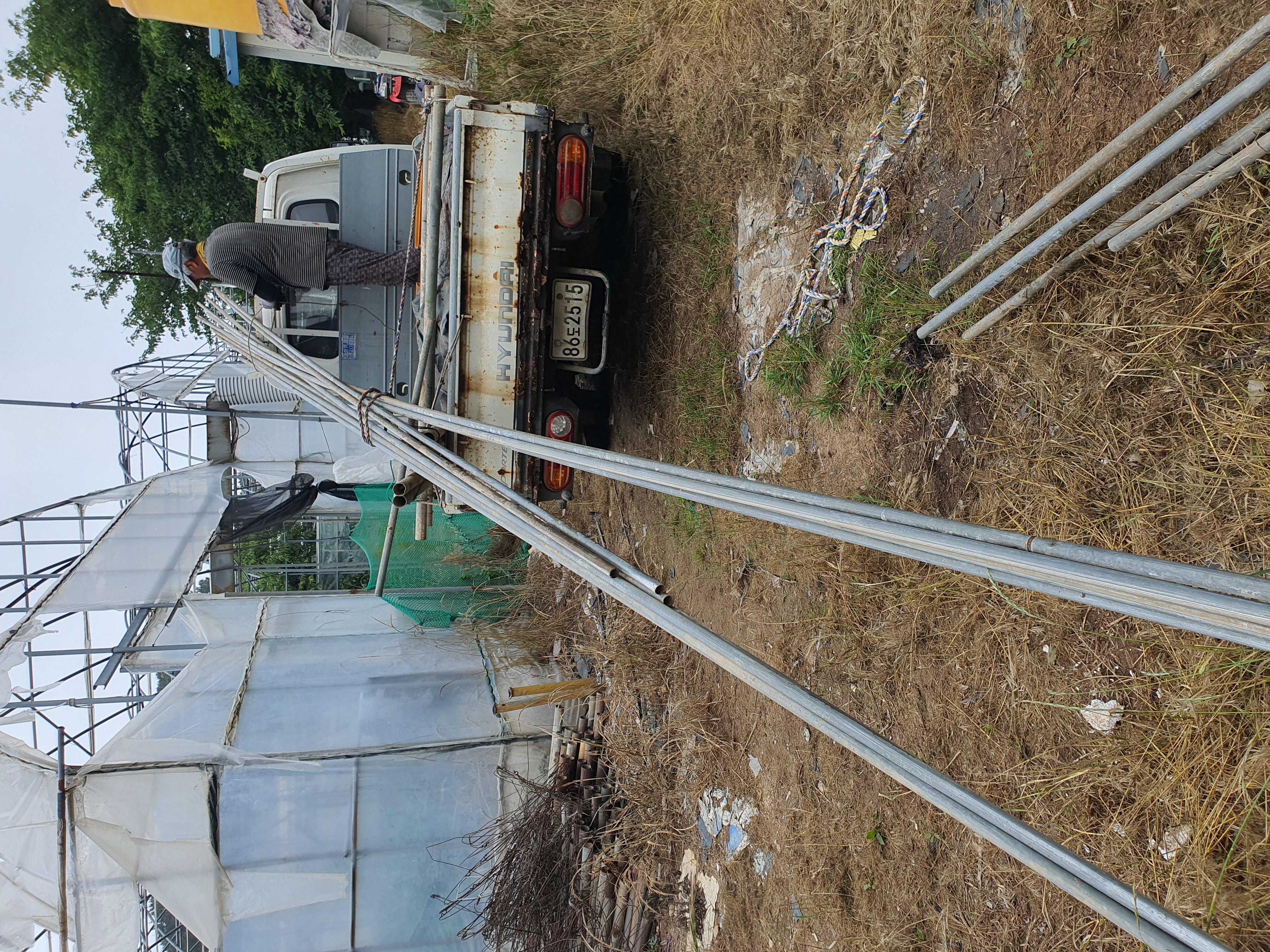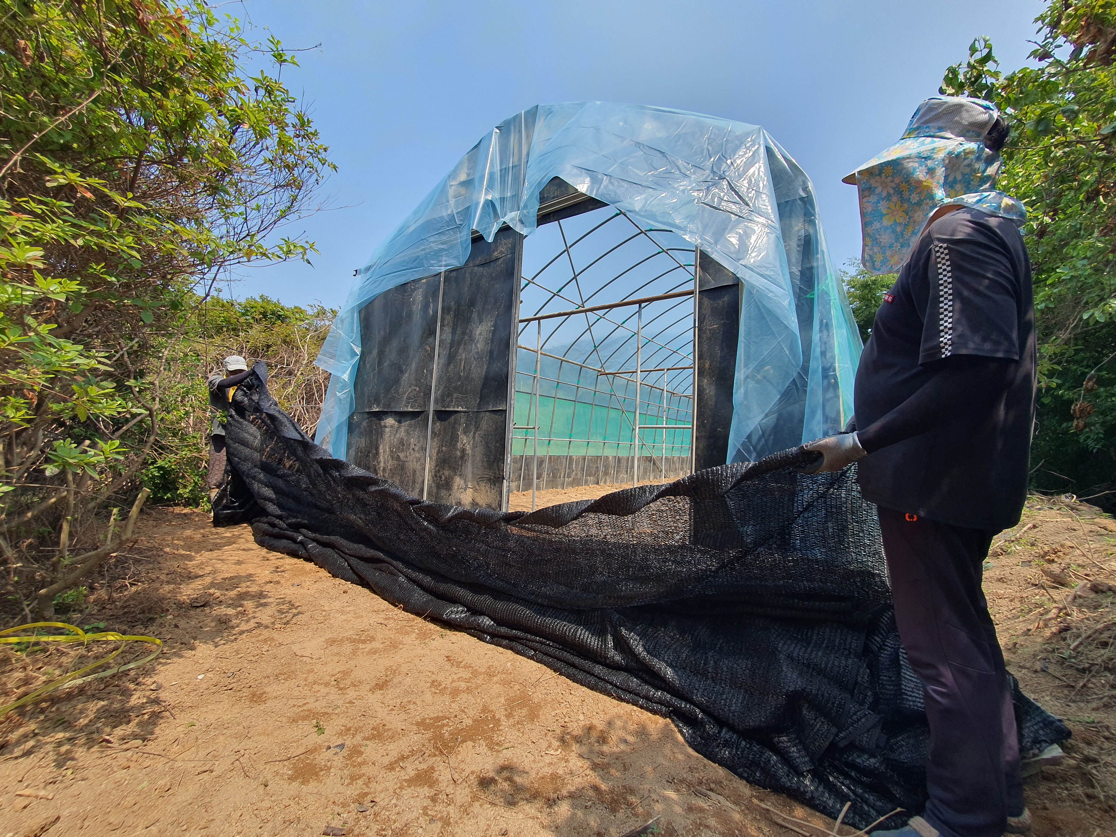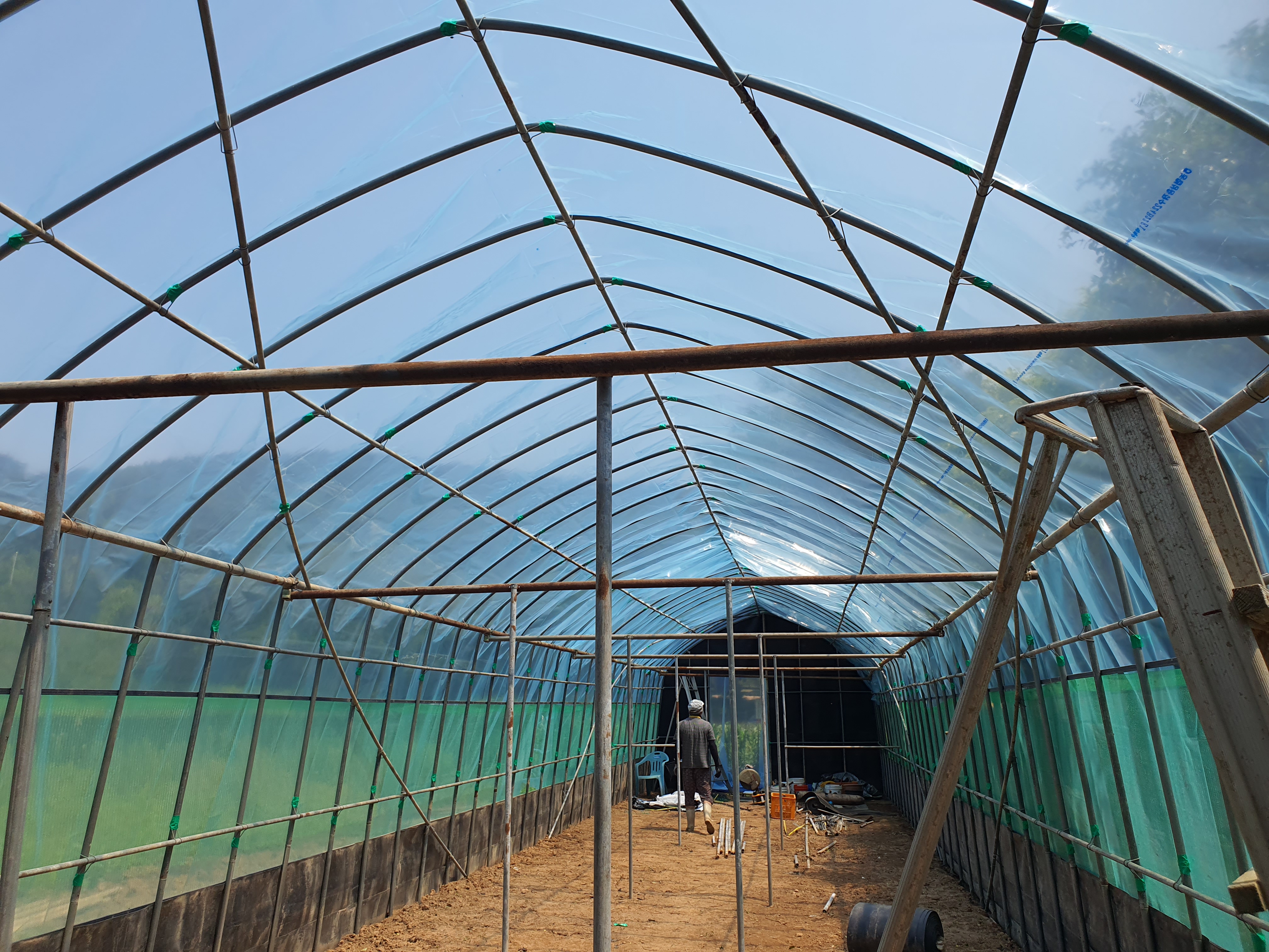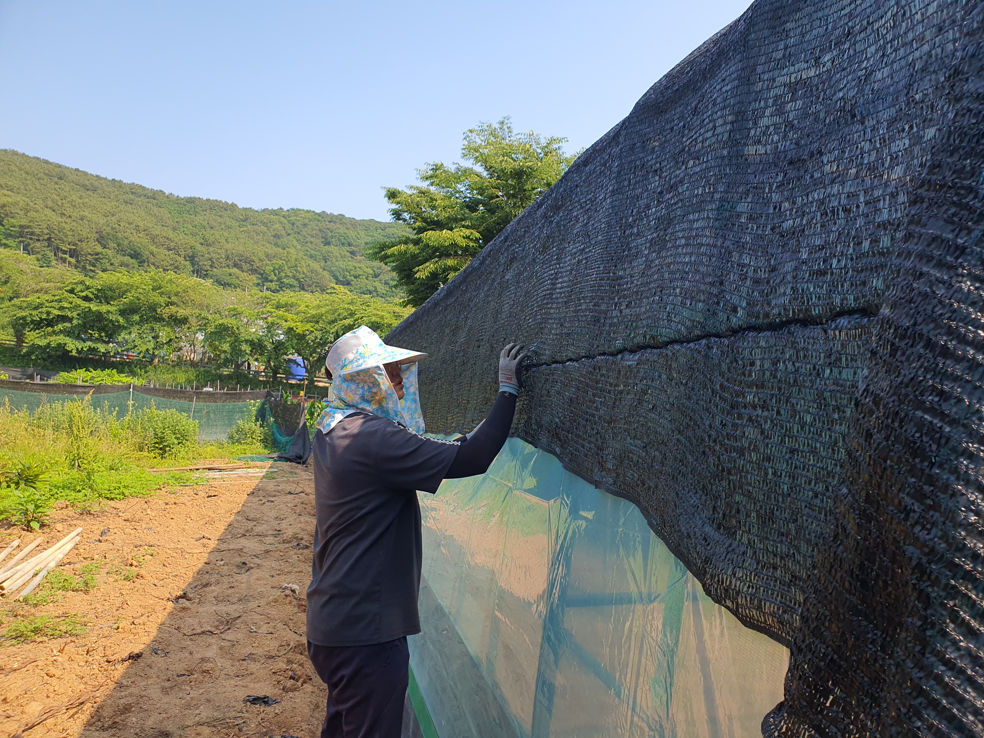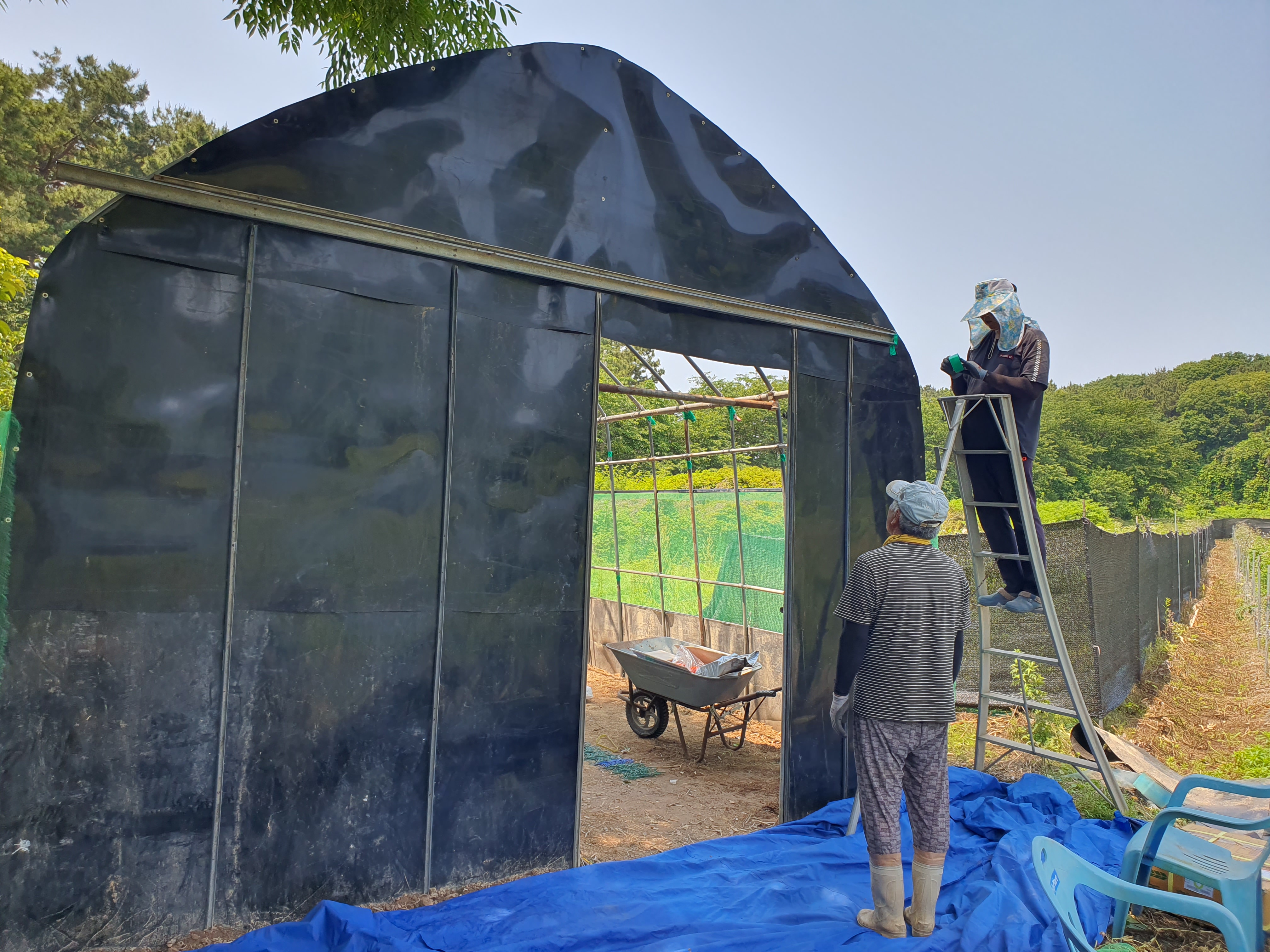 건조하우스 비닐과 차광망 씌우기 아들과 아버지