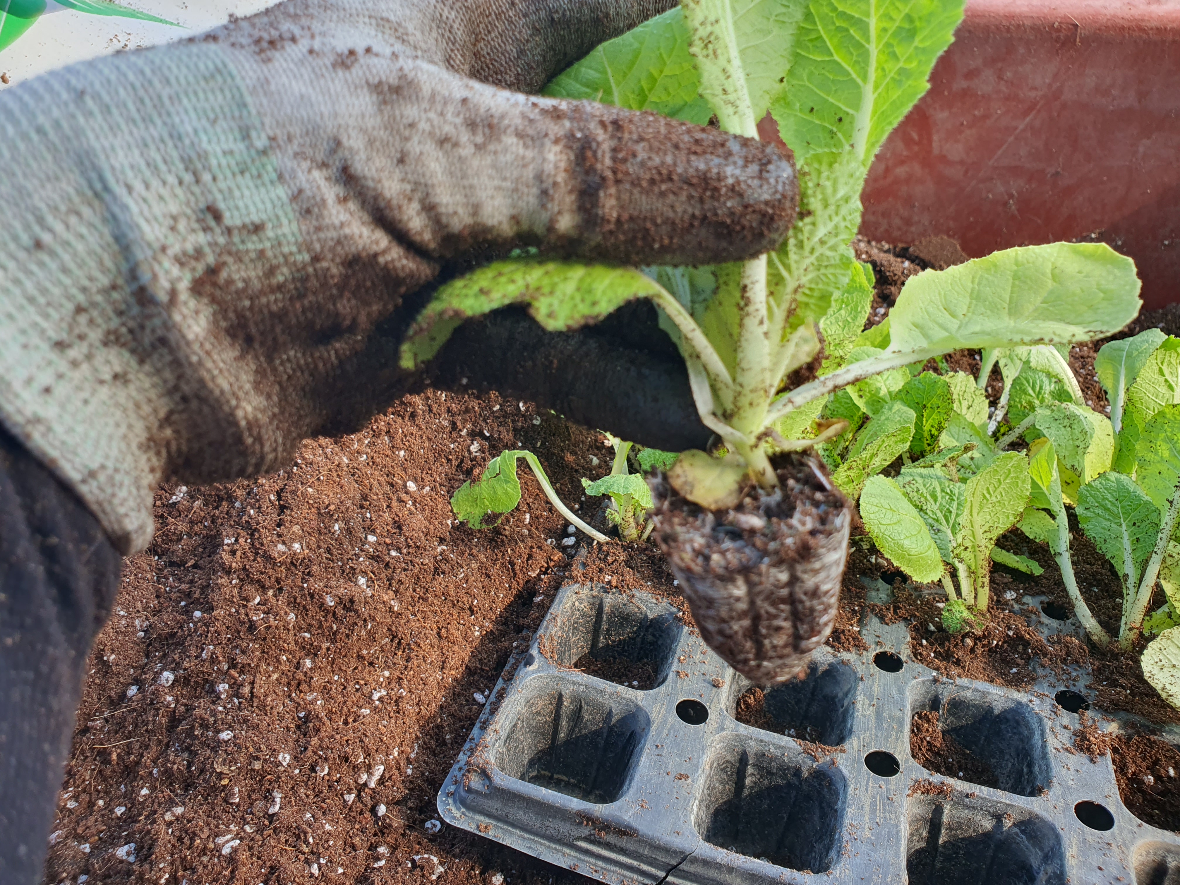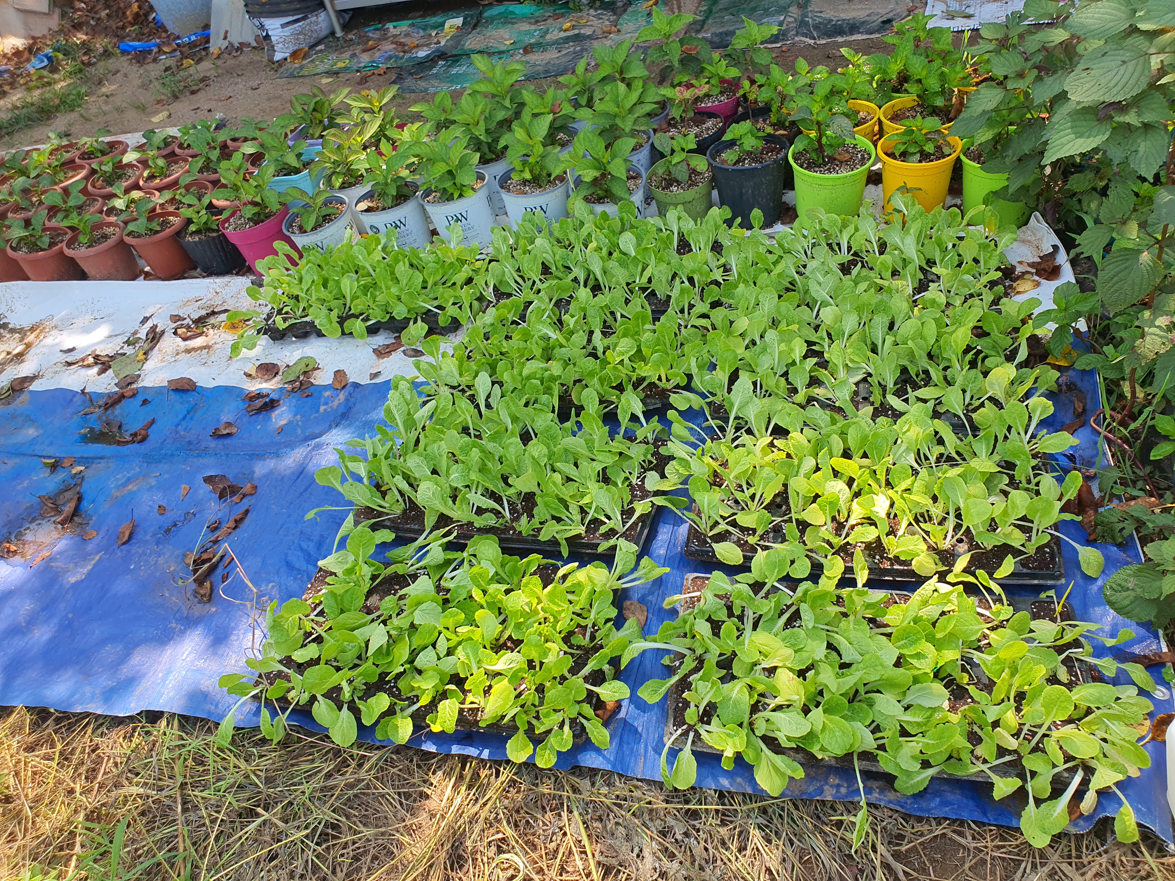 밭으로 와서 배추모종 큰 포트로 옮기고 있습니다.