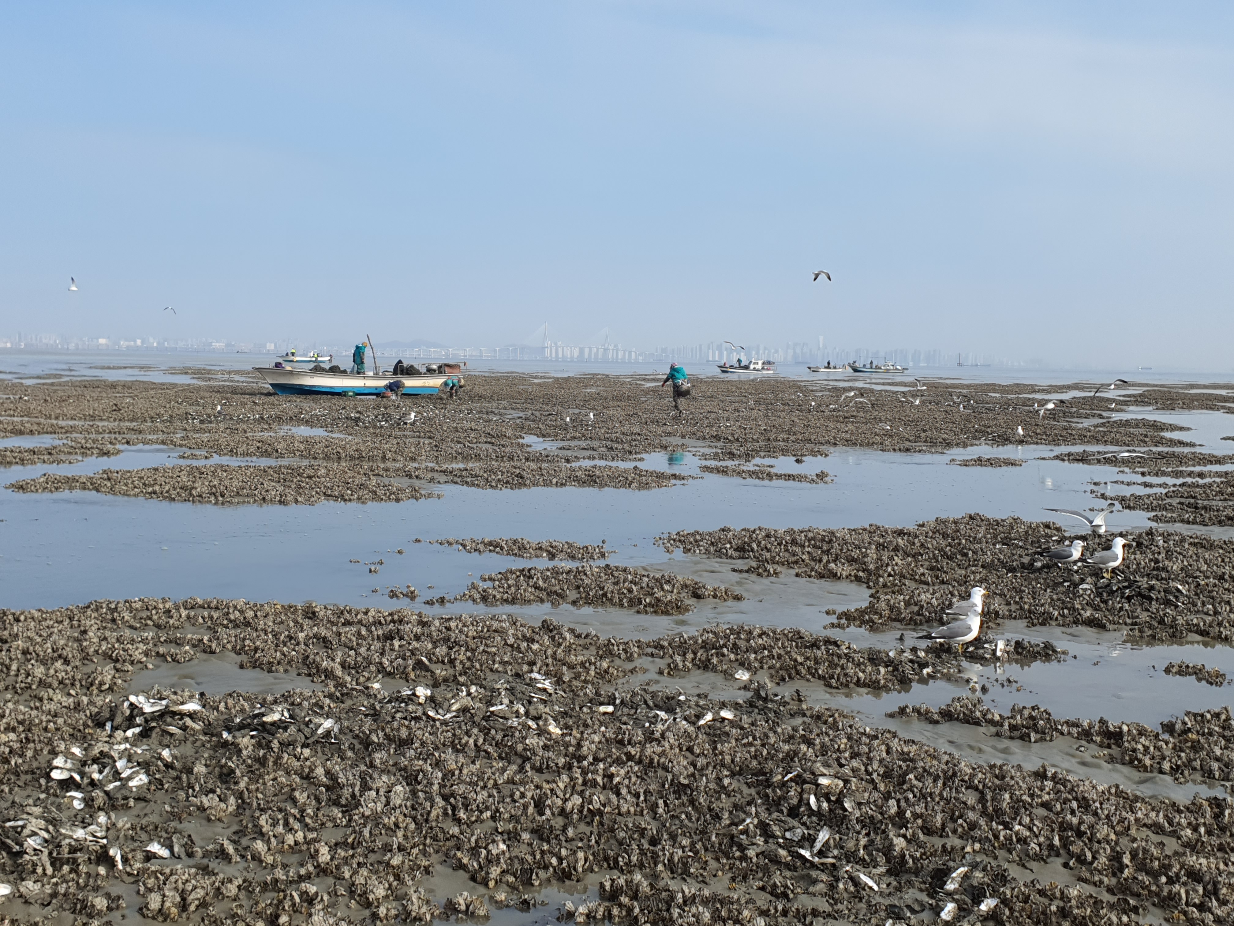 굴 깐곳에서 갈매기들이 굴딱지에 붙은 굴을 먹습니다.