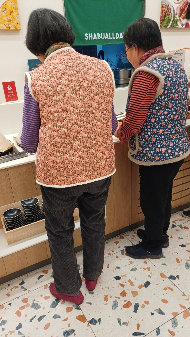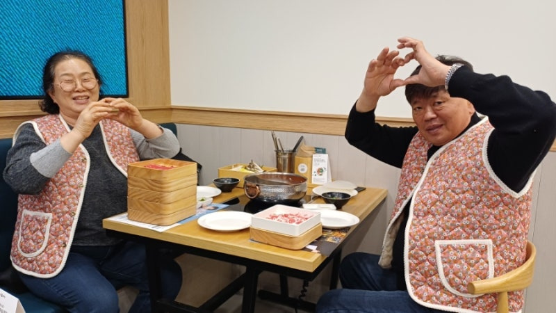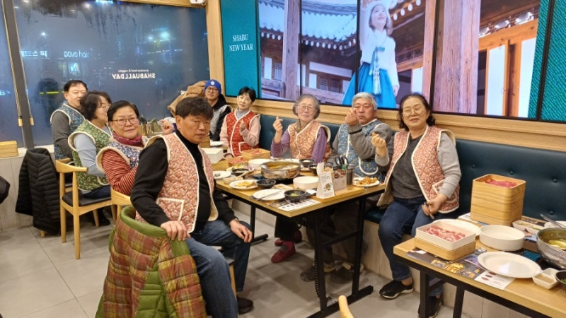 요즘 유행인 꽃무늬 털쪼끼를 단체복으로 따뜻허게 입고 웃음 가득 샤브올데이