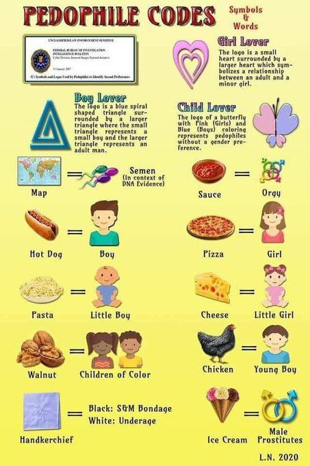 상기 짤은 소아성애 비밀 코드다. 피자는 소녀를, 핫도그는 소년을 지칭한다.일년에 아동 실종자가 800만명에 달한다. 그 이유가 '피자 게이트' 때문이라면 믿겠는가?