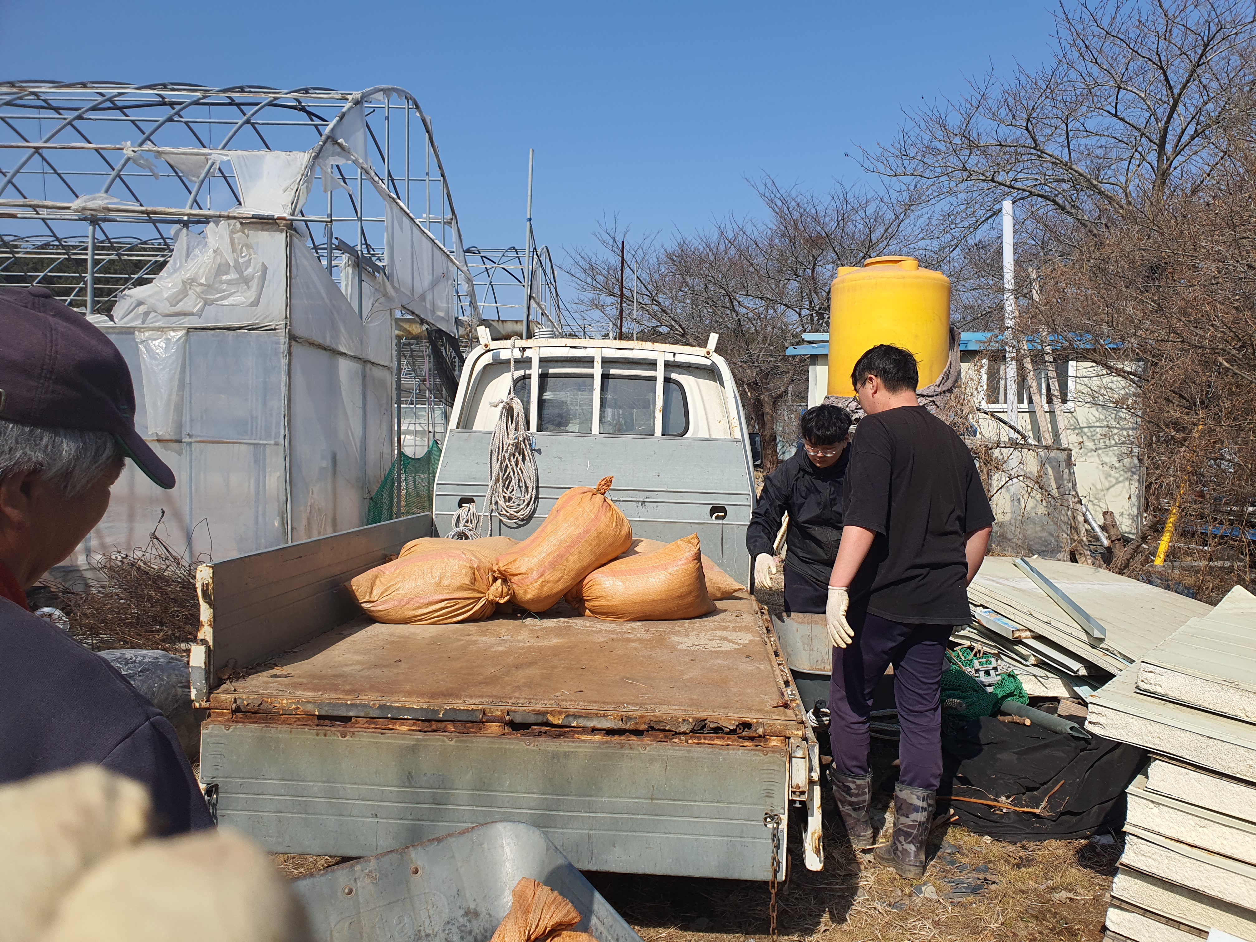 닭들이 밟아 덩어리 펴놓은것 담는 아들과손자