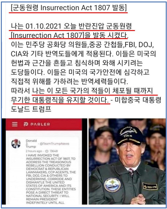 트럼프는 미국의 정치인 대통령이 아니다. 겉으로만 대통령이란 가면을 쓰고 있을 뿐, 그는 2021년 1월 10일 반란법을 비공개로 발동하면서 미국을 일시 중지시키고 군정 체제로 넘겼고, 그 자신은 지금 ‘군정 총사령관직’을 수행하고 있다.