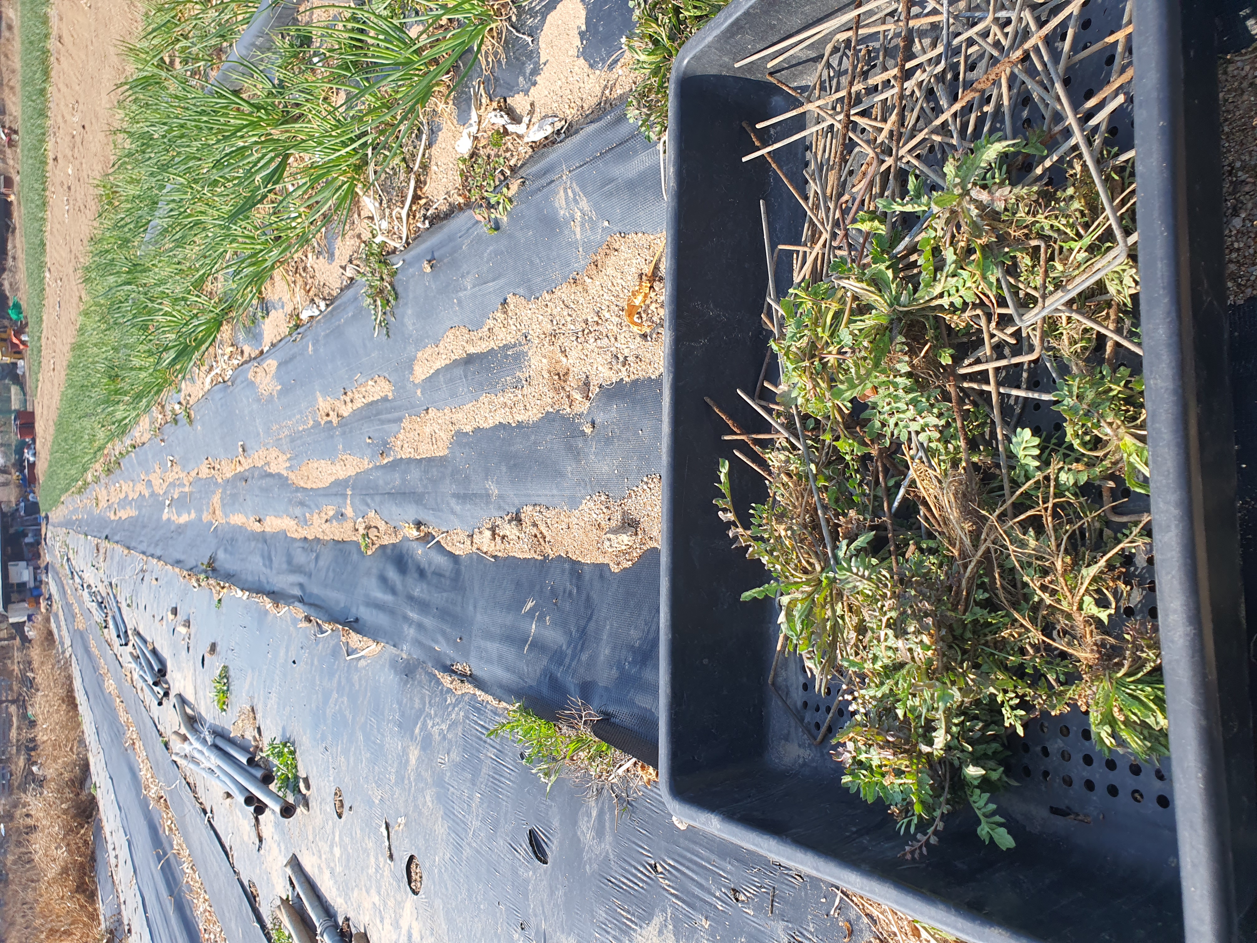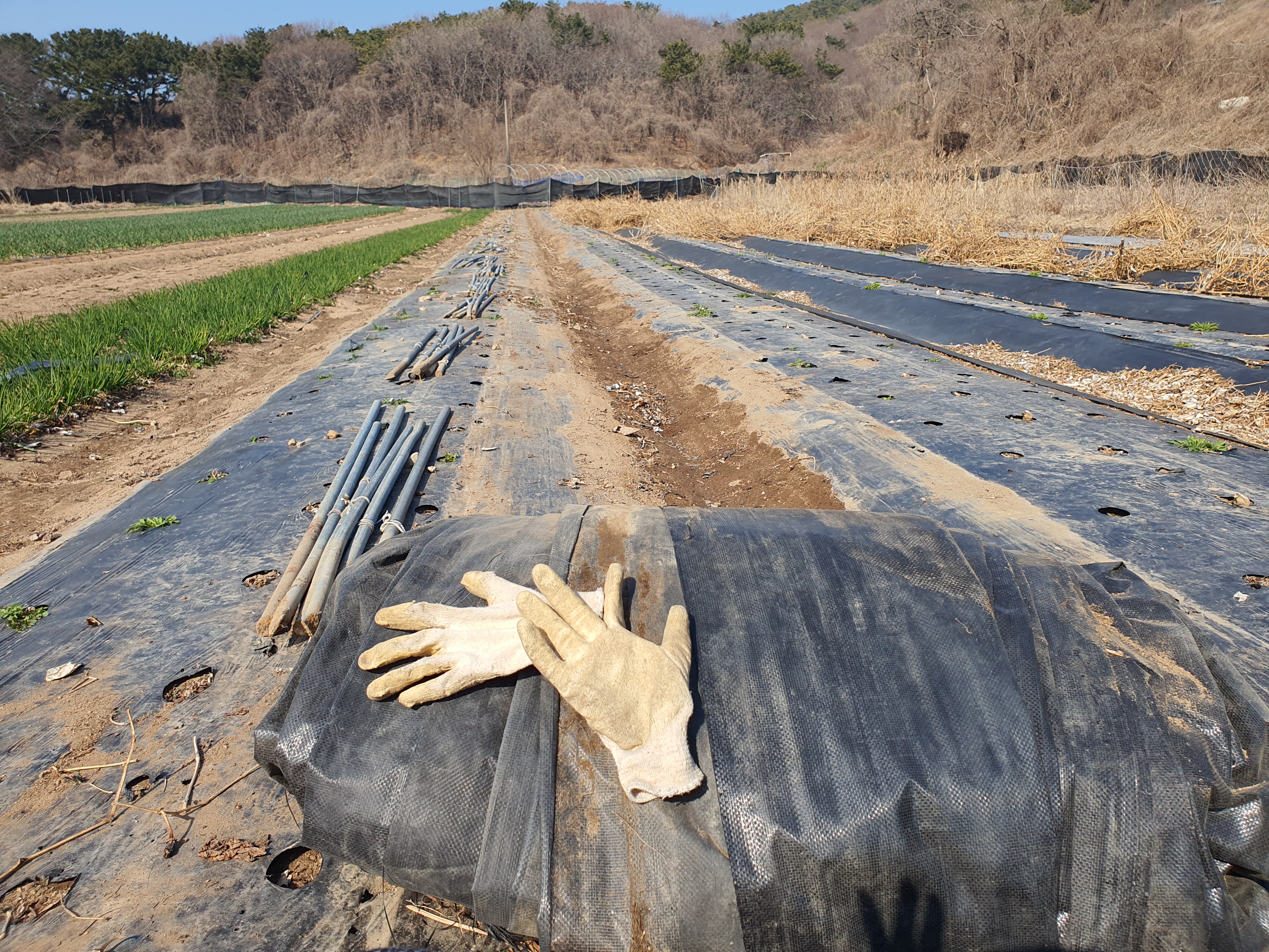 부직포 고정핀 뽑고 걷어내며 냉이도 캐고