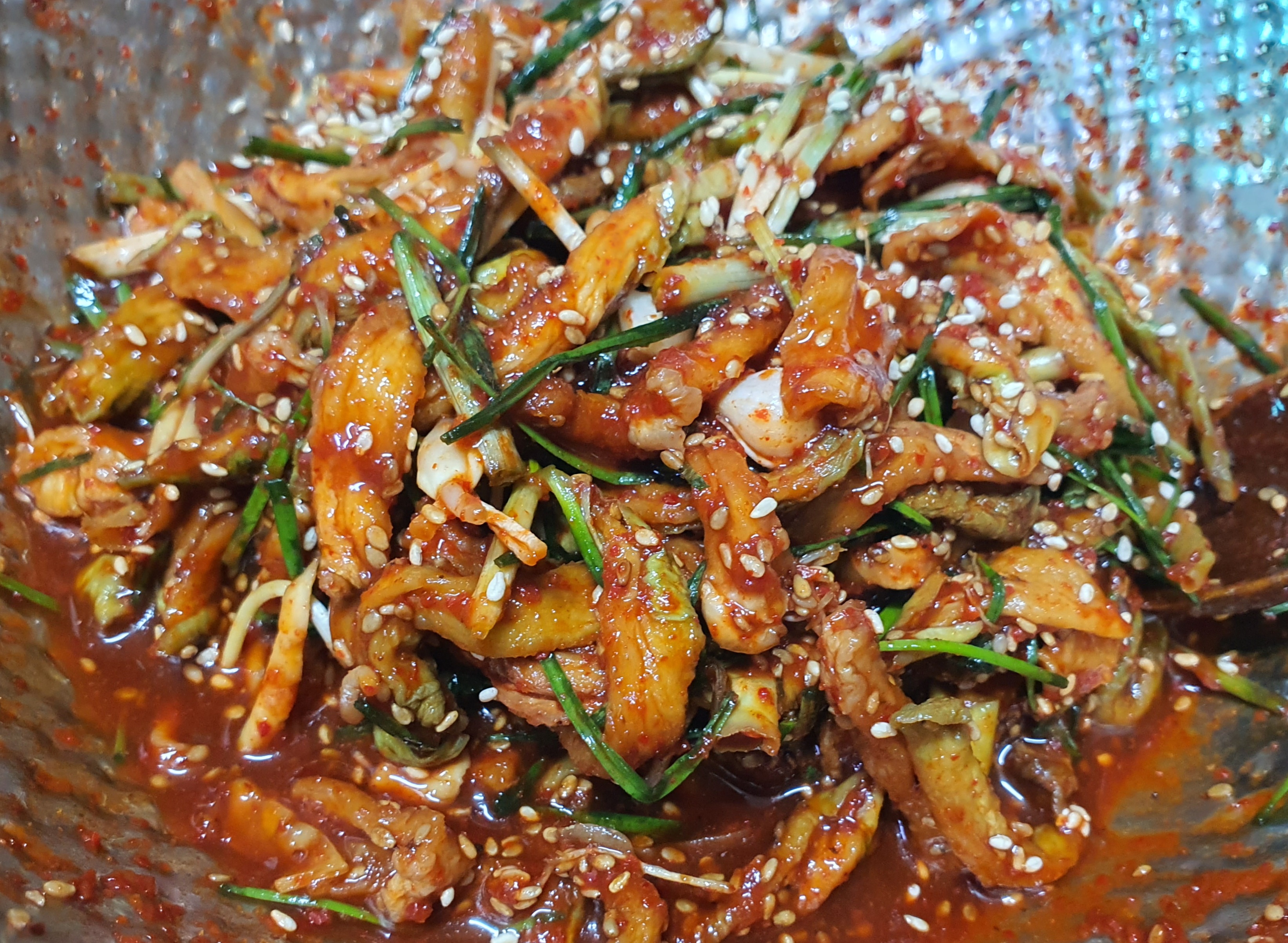 *짠지무 새콤달콤 무치고(손자가 우리 할머니가 무친 짠지무가 제일 맛있다고 했다고해서)