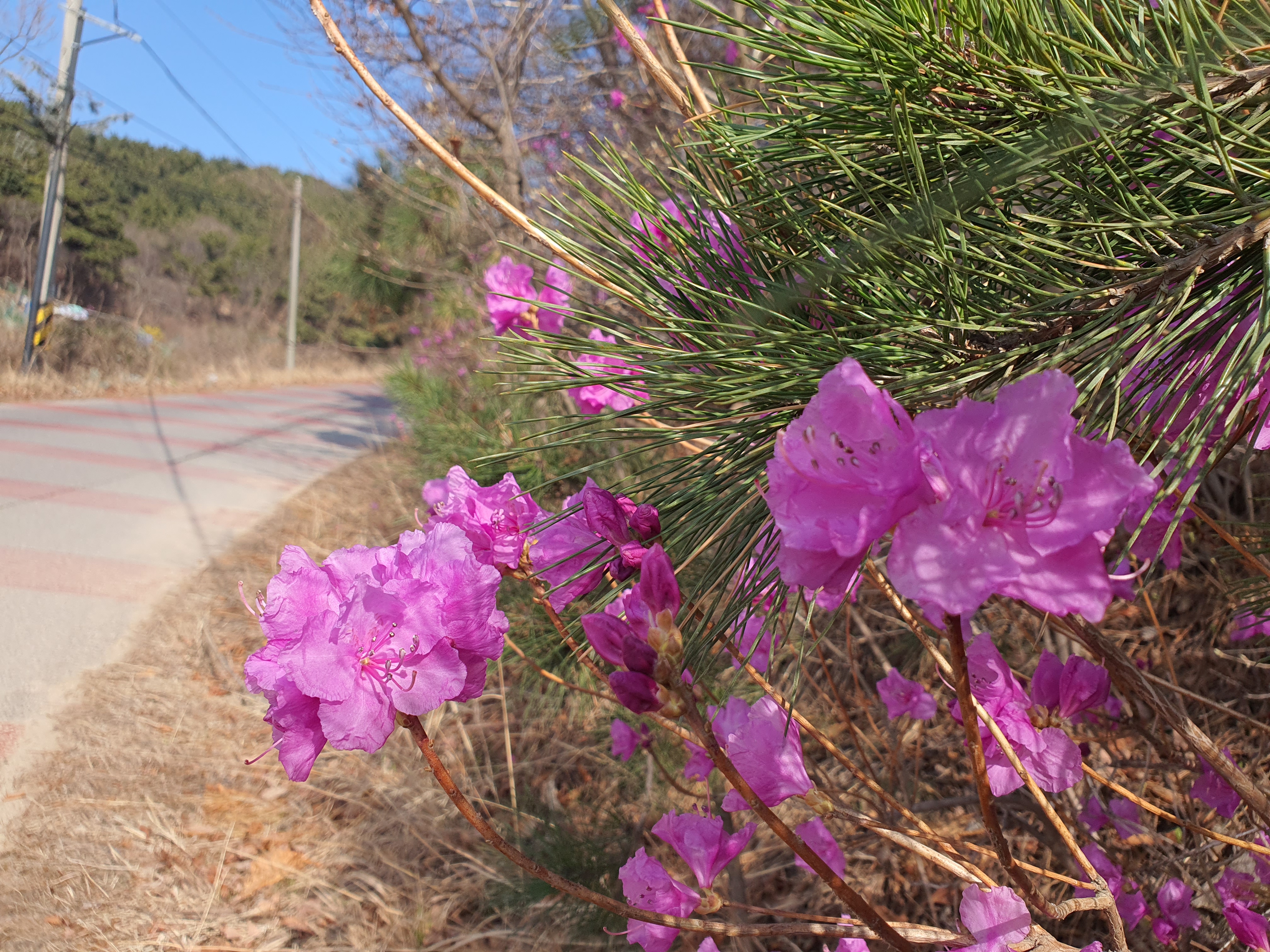 걸어가며 도로 주변에 핀 진달래