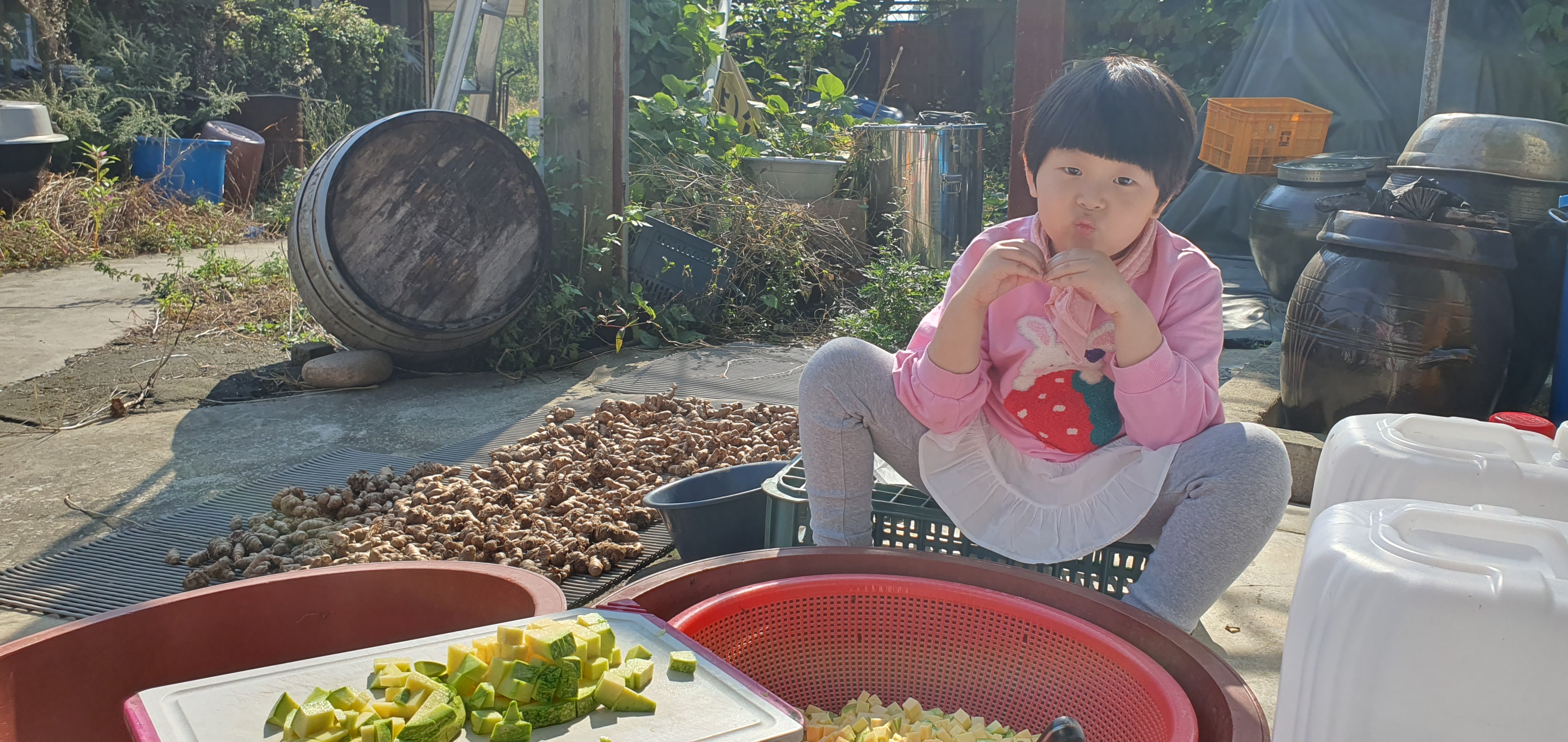 할머니가 호박 썰으면 기영이가 소쿠리에 담기