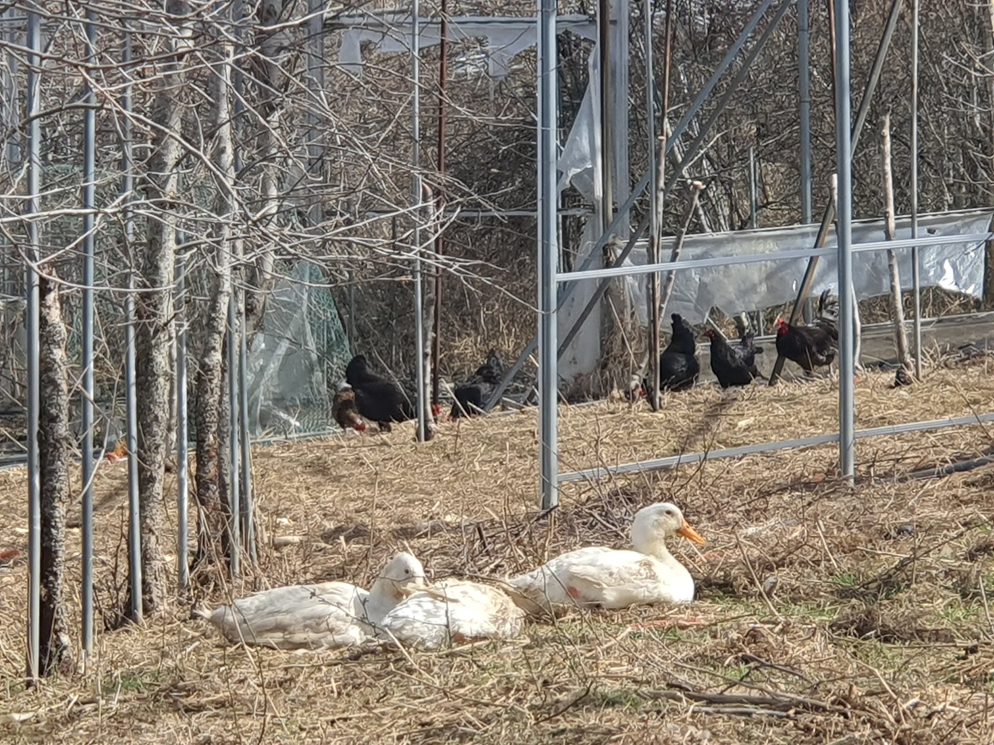 밭에서 일광욕중인 거위와 오리