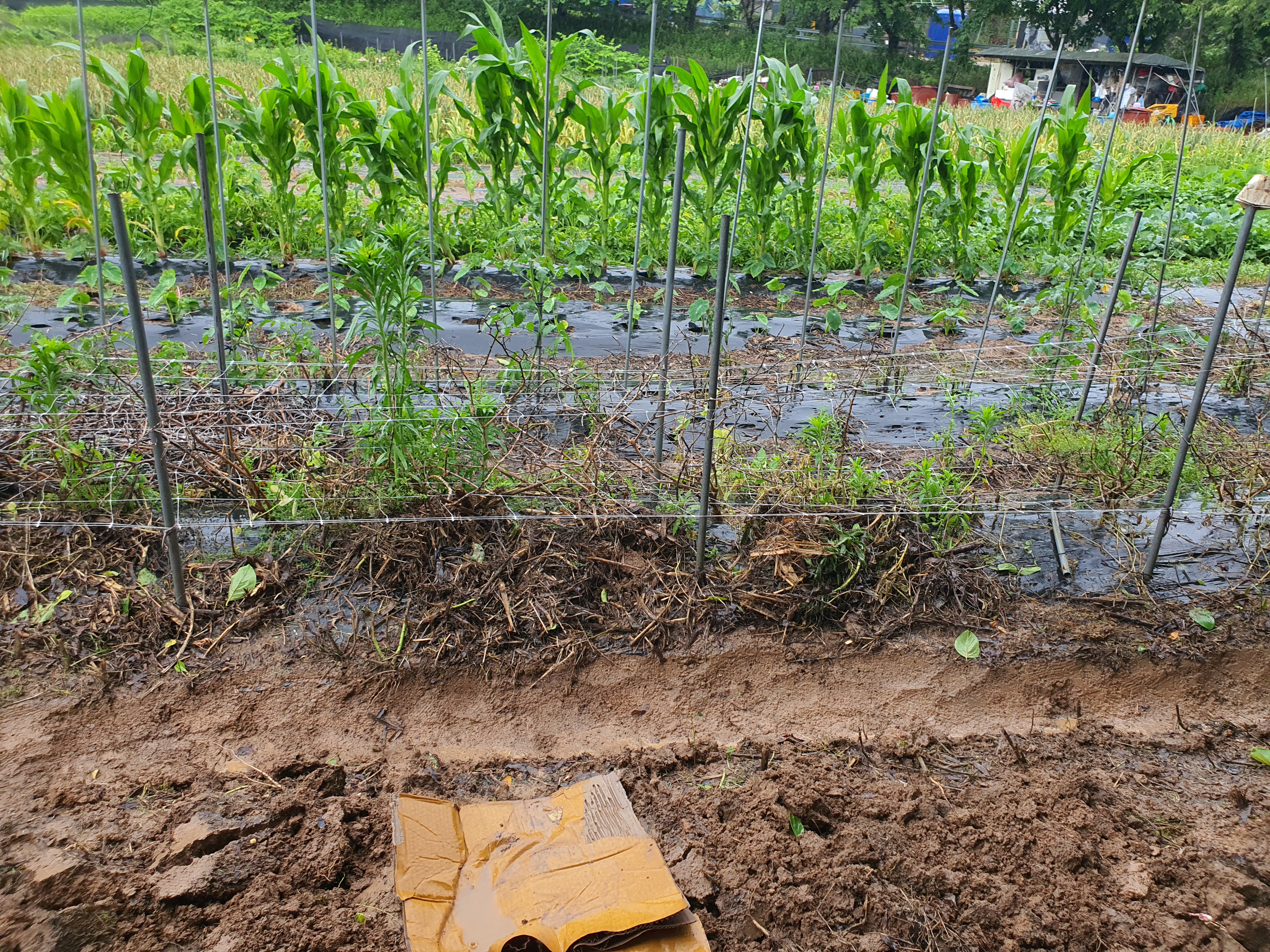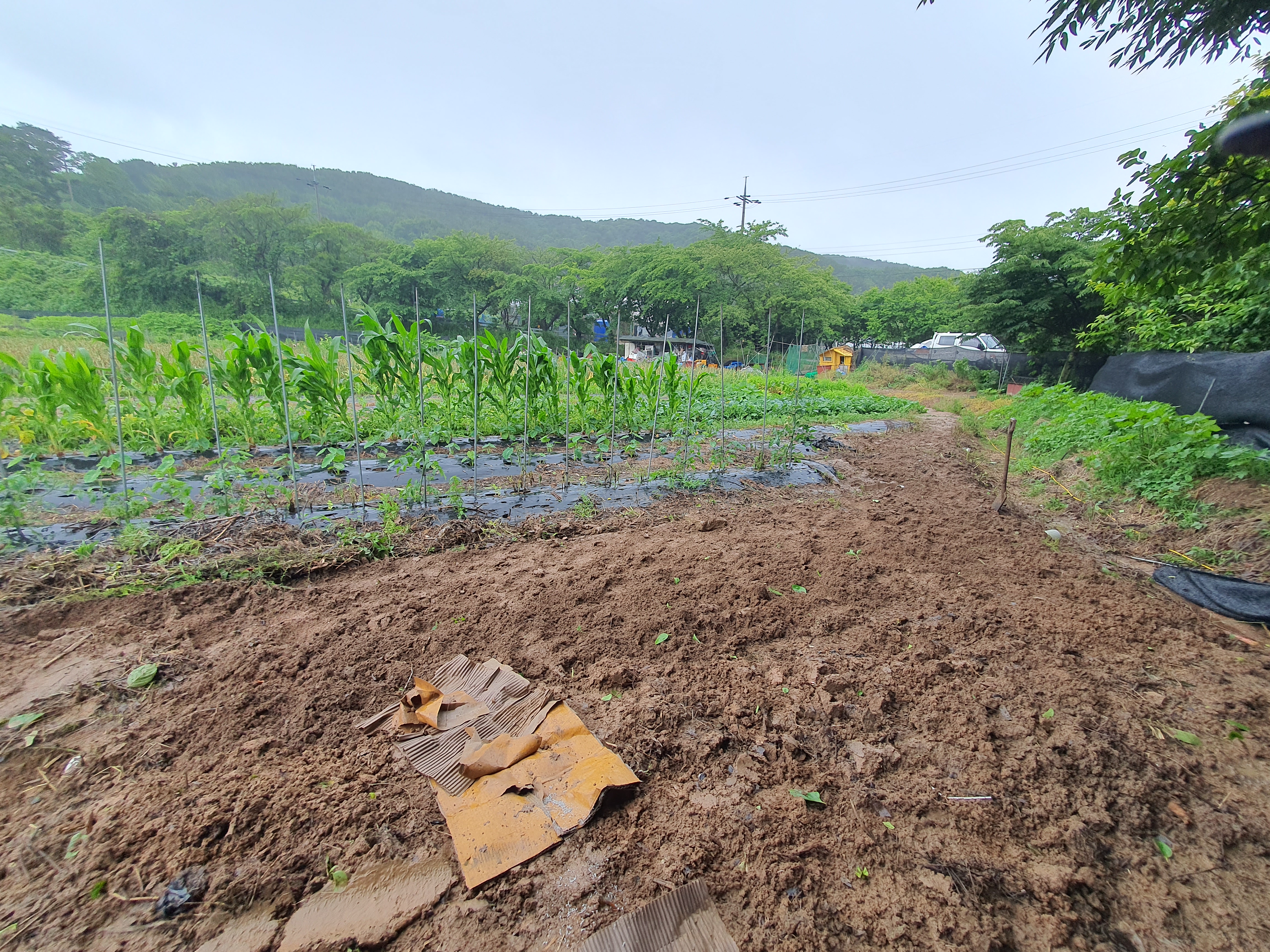 마무리가 안된 상태에서 비가 100ml 정도 내리니 하우스 양쪽에서 물이 스며들어 하우스 바닥이 질척거려