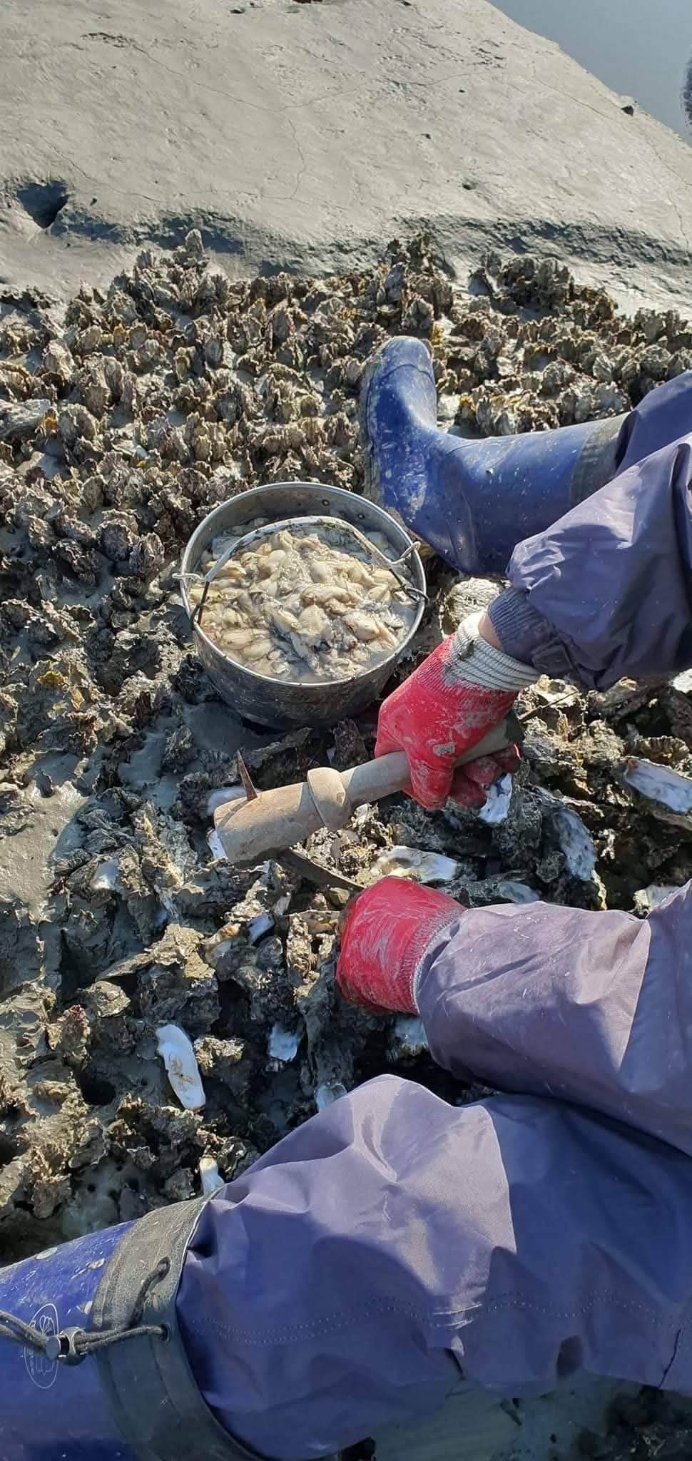 갯벌에 앉아 6시간씩 굴을 1개씩 까서 땁니다.